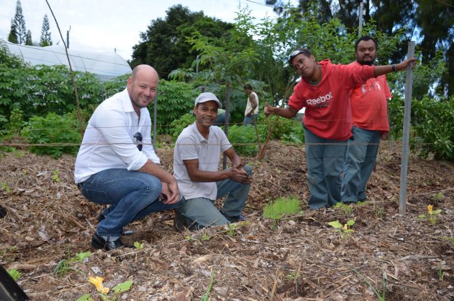 Légende : Après la présentation des mesures, Christopher Gygès a visité le CAT de Tina-sur-Mer où des adultes déficients intellectuels participent à des activités à caractère professionnel. Ici, l’activité agriculture. …
