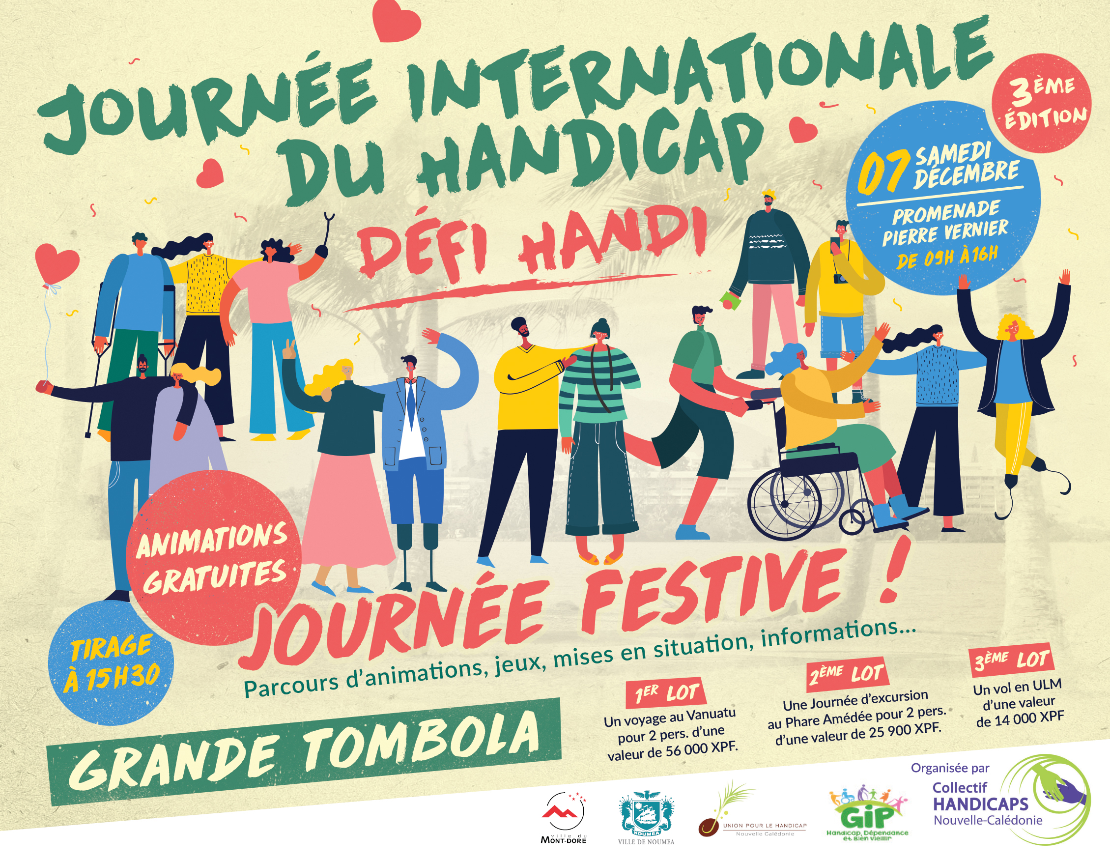Chaque année depuis 1992, la Journée internationale du handicap proclamée par l’ONU a lieu le 3 décembre. A cette occasion, le Collectif Handicaps Nouvelle-Calédonie organise une journée festive tous publics ce samedi 7 décembre, de 9h à 16h, à la promenade Pierre-Vernier.