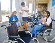 Equipés de matériels destiné à diminuer leurs capacités de déplacement, les étudiants pointent du doigt le terrain accidenté, la hauteur des marches ou encore des voitures mal garées. Julianne, en seconde année de SVT (Sciences de la vie et de la terre), a tenu à se mettre à la place d’une personne en fauteuil.