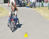 Dans le gymnase et sur le terrain de sport, les activités sont ludiques : marquer un panier en handibasket, faire une course handisport par écran interposé ou encore tester un tricycle à conduite manuelle – le Trike – avec pour professeur des champions de ces disciplines sportives.