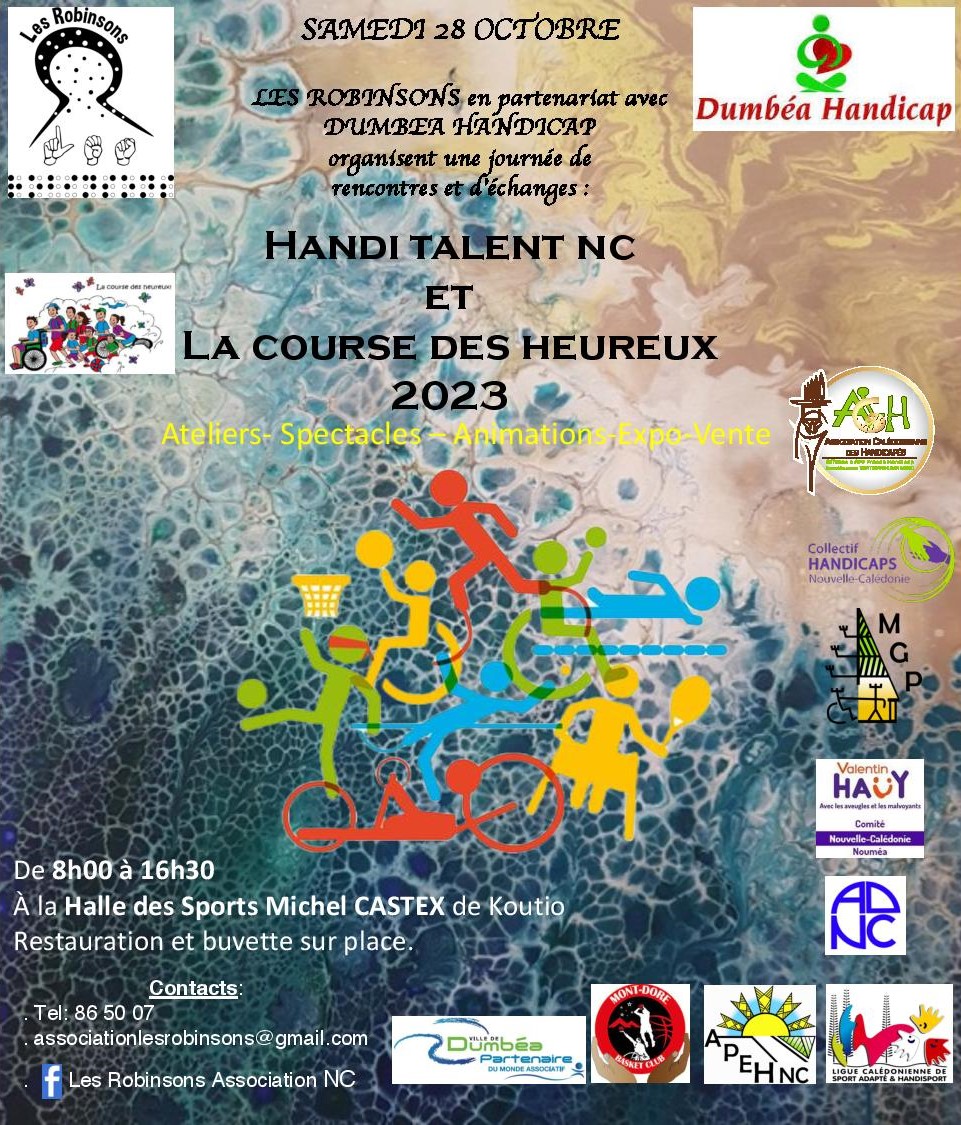 L’association LES ROBINSONS en partenariat avec l’association Dumbéa Handicap organise la journée “Handi Talent NC” et “la course des heureux” ce samedi 28 octobre 2023 à la Hall des sports Michel Castex de Koutio de 9h à 16H30.
