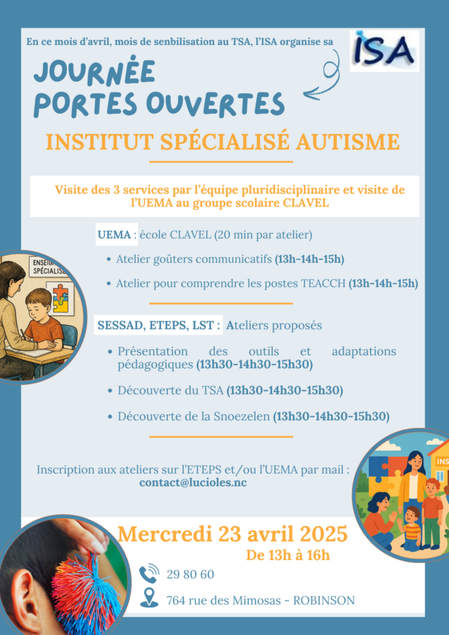 Dans le cadre du mois de sensibilisation au « TSA » l’équipe pluridisciplinaire de l’Institut Spécialisé Autisme « Les Lucioles » à le plaisir de vous recevoir dans les locaux…